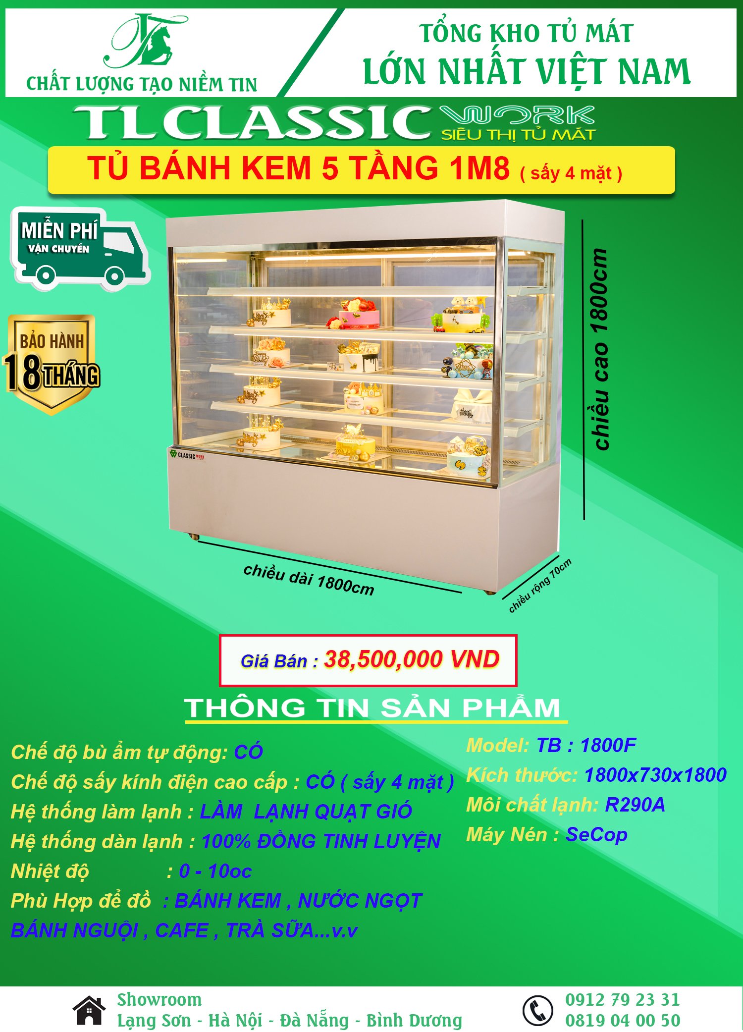 Tủ bánh kem 1m8 cao 5 tầng có kiểu dáng đứng hình hộp chữ nhật, kết hợp với mặt kính vuông giúp trưng bày sản phẩm với số lượng lớn, tăng vẻ đẹp sang trọng, chuyên nghiệp cho cửa hàng.