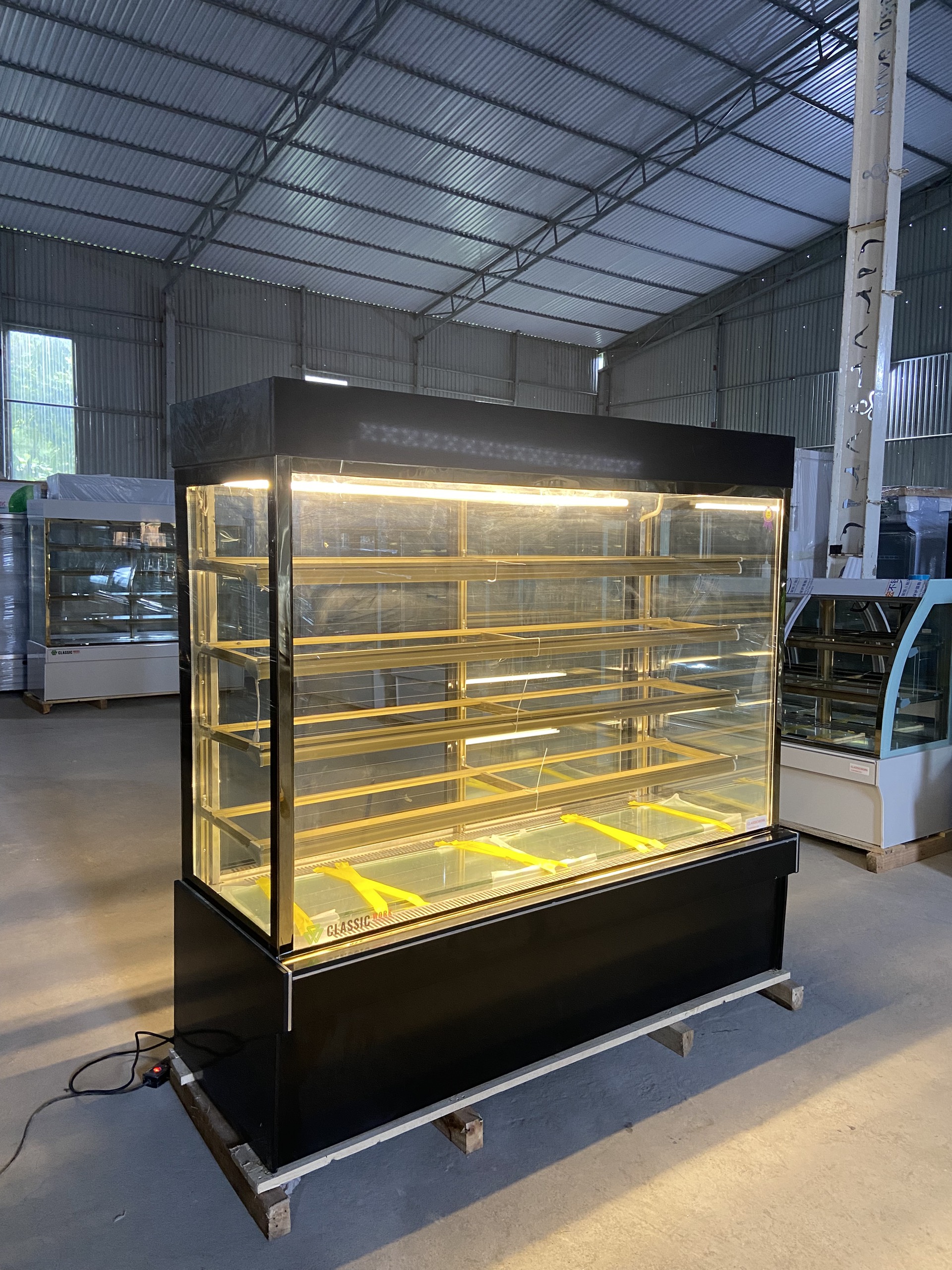 Tủ bánh kem 1m8 cao 5 tầng có kiểu dáng đứng hình hộp chữ nhật, kết hợp với mặt kính vuông giúp trưng bày sản phẩm với số lượng lớn, tăng vẻ đẹp sang trọng, chuyên nghiệp cho cửa hàng.