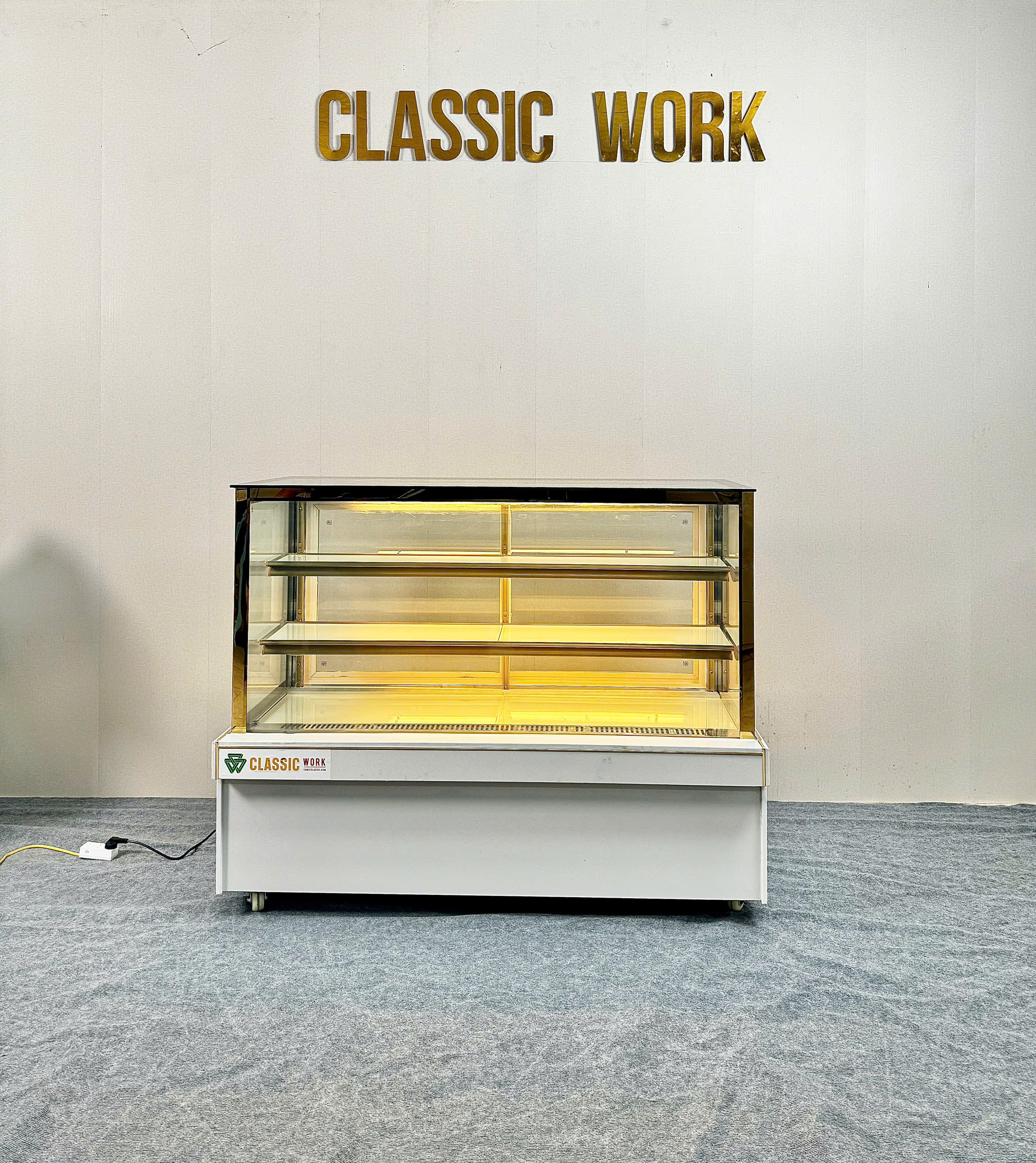 Tủ bánh kem kính vuông 3 tầng 1m5 màu trắng viền vàng là lựa chọn hoàn hảo cho các cửa hàng, tiệm bánh, quán cà phê và nhà hàng cao cấp. Với thiết kế sang trọng, chất liệu cao cấp và các tính năng hiện đại, tủ bánh kem không chỉ giúp bảo quản bánh luôn tươi ngon mà còn nâng cao giá trị thẩm mỹ cho không gian trưng bày.