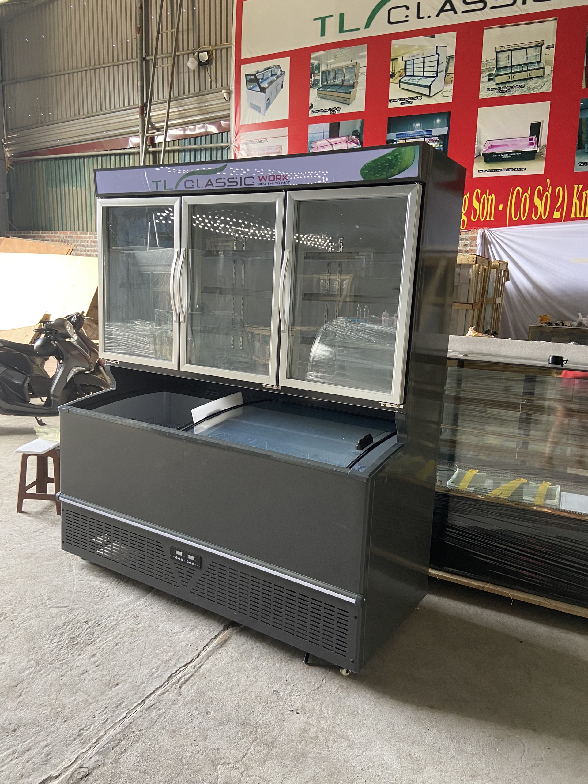 Ngăn mát thiết kế 3 cánh kính mở, dùng để trưng bày đồ có nhiệt độ từ 0-10 độ C