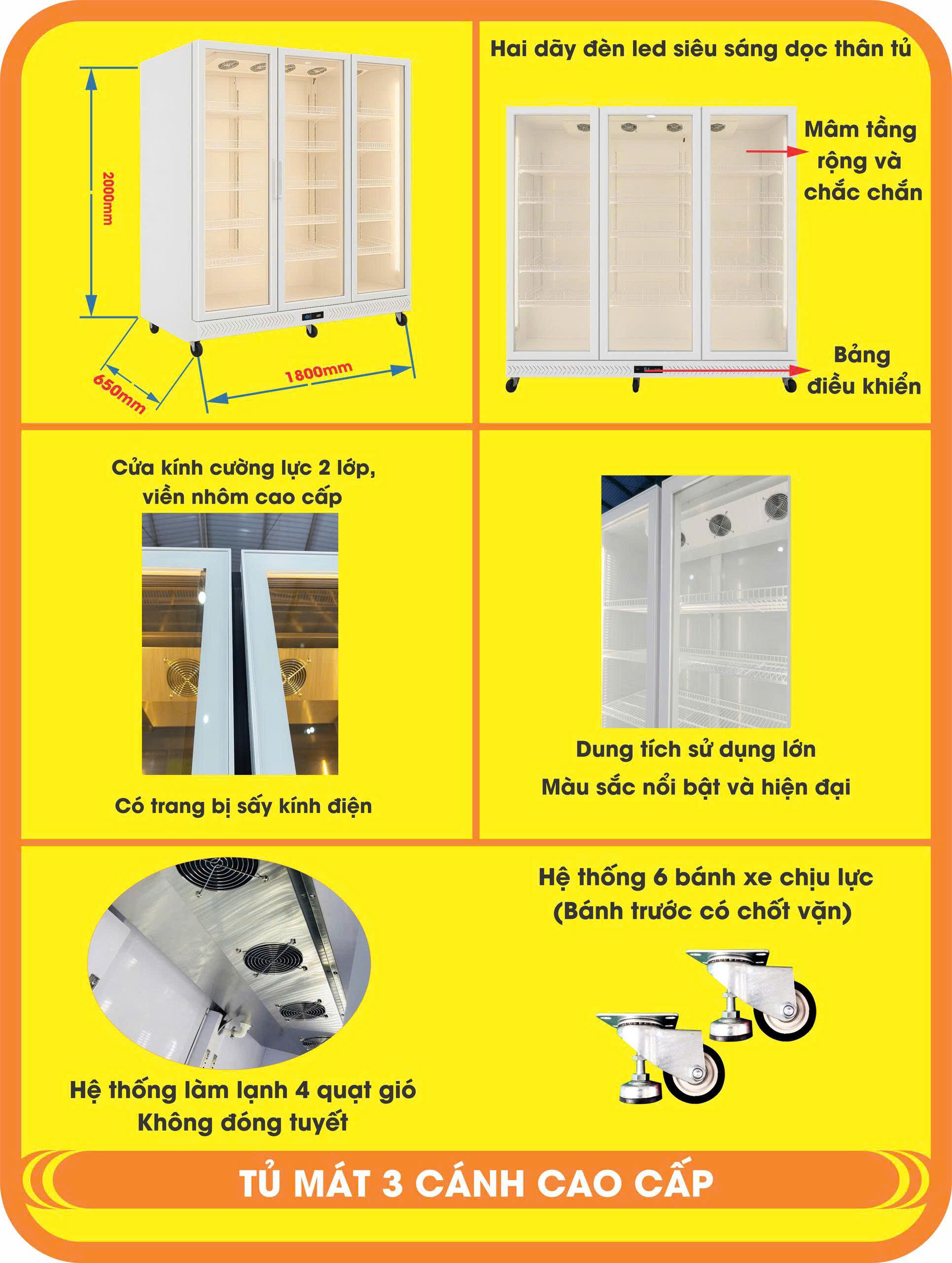 Với thiết kế hiện đại, sang trọng cùng chất liệu kính cường lực cao cấp, sản phẩm tủ mát cao cấp 3 cánh kính full viền không nóc không những mang lại tính năng tiện ích tuyệt vời mà còn mang lại vẻ đẹp thẩm mỹ tuyệt vời cho không gian. Hãy cùng tìm hiểu thêm về sản phẩm này để cải thiện ngay tiêu chí bảo quản và trưng bày thực phẩm cho cửa hàng hay nhà hàng của mình nhé !