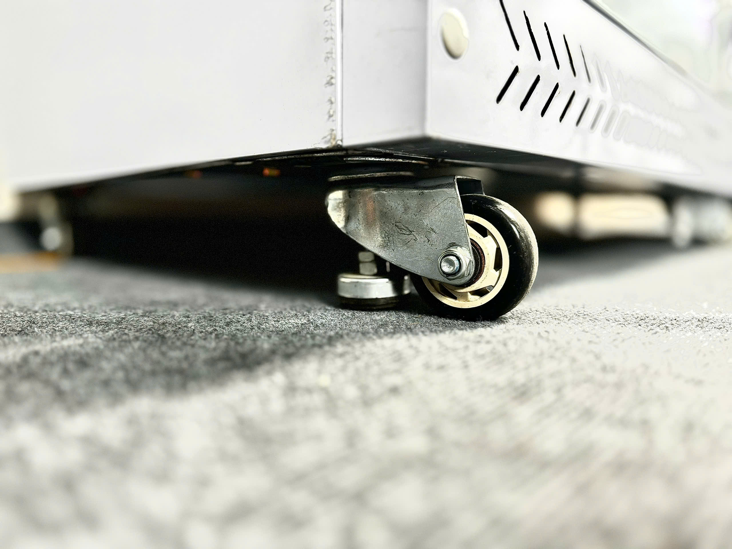 Tủ mát được thiết kế với chân bánh xe chịu lực với 2 bánh trước có cơ cấu khóa bánh, giúp dễ dàng di chuyển, bố trí sắp xếp vị trí lắp đặt tủ.